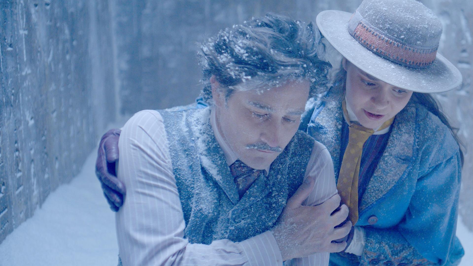 In einer alten Ruine mit Hieroglyphen an den Wänden, legt Theodosia ihrem erschöpften Vater Alistair den Arm um die Schultern. Alles ist voller Eis und beide sehen erschöpft und fast erfroren aus.