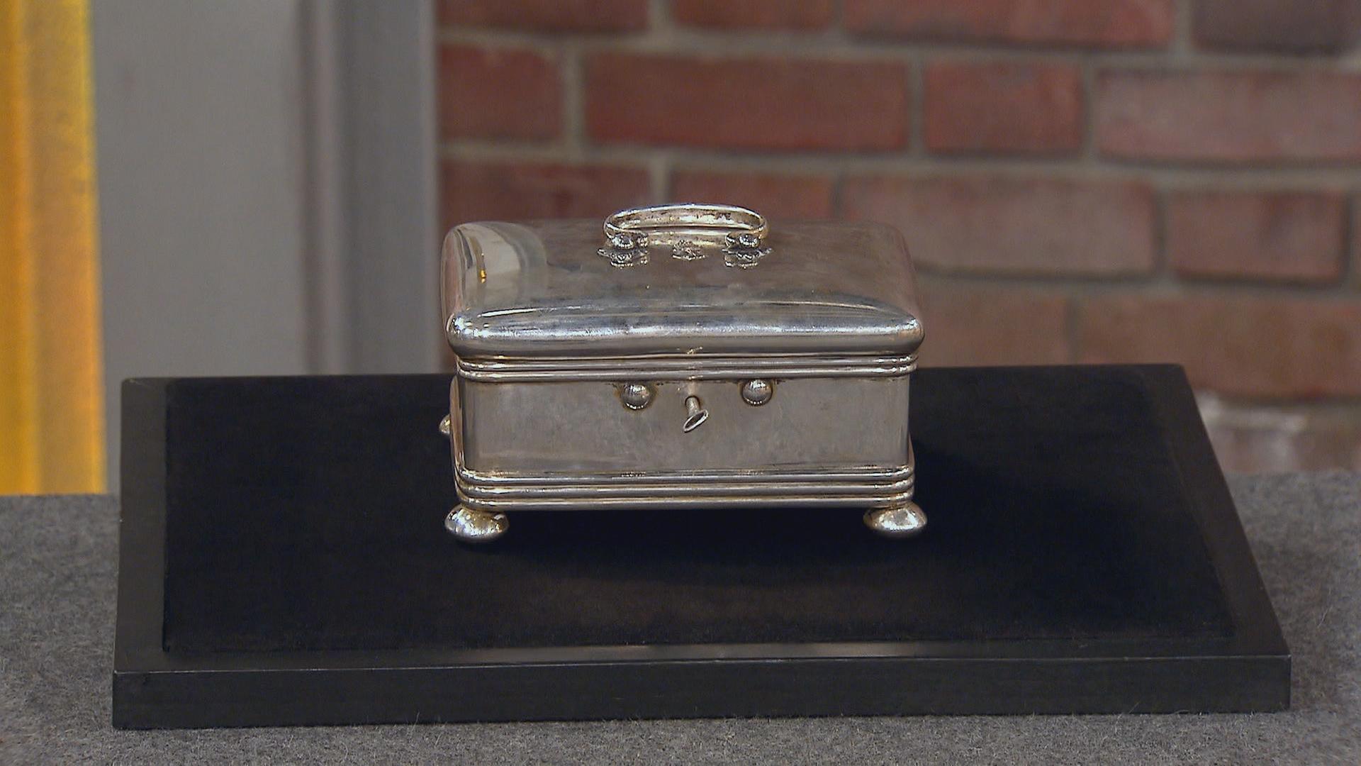 Eine silberne Schatulle steht auf schwarzem Grund. Sie schmückt ein verzierter Griff und kleine Füßchen.