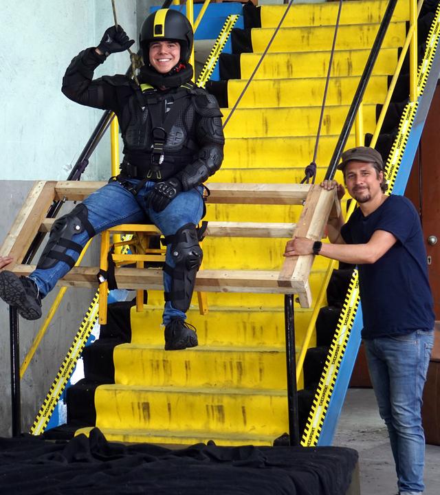 Die Treppe zu lang und wieder zu spät an der Tür? Tommy und das Testteam wissen, was zu tun ist. Aber: Schutzausrüstung ist bei diesen Tests ein Muss!